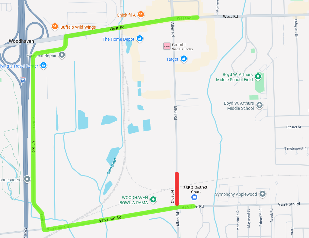 Northbound: From Allen Road, turn west on Van Horn Road, then north onto Ford Lane, and east to West Road.  Southbound: From Allen Road, turn west onto West Road, then south onto Ford Lane, and east to Van Horn Road.